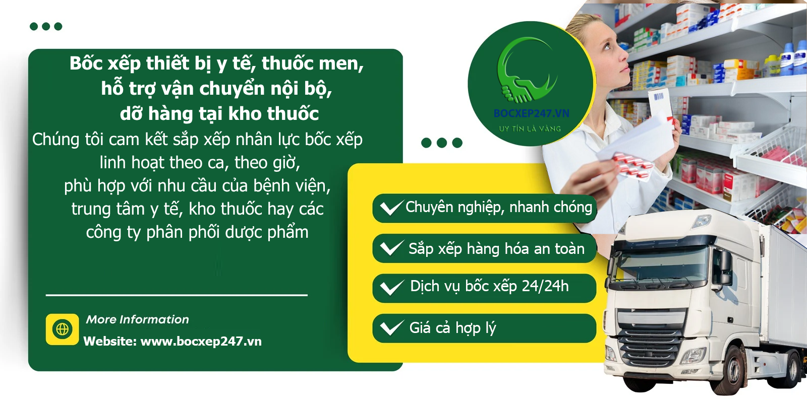 Trong ngành y tế, việc bốc xếp thiết bị y tế, thuốc men, hỗ trợ vận chuyển nội bộ và dỡ hàng tại kho thuốc đóng vai trò quan trọng trong việc đảm bảo chuỗi cung ứng y tế hoạt động trơn tru. Với tính chất đặc thù của các sản phẩm y tế, từ thiết bị y khoa đến thuốc men, yêu cầu về sự cẩn thận, an toàn và hiệu quả trong quá trình bốc xếp và vận chuyển là tối quan trọng. Bài viết này sẽ phân tích chi tiết về quy trình, lợi ích và các yếu tố cần lưu ý khi thực hiện các dịch vụ này, đồng thời giới thiệu các giải pháp chuyên nghiệp từ CÔNG TY TNHH THƯƠNG MẠI DỊCH VỤ VẬN TẢI NHÂN LỰC THÀNH TÍN 247, một đơn vị uy tín trong lĩnh vực cung ứng lao động và bốc xếp hàng hóa.