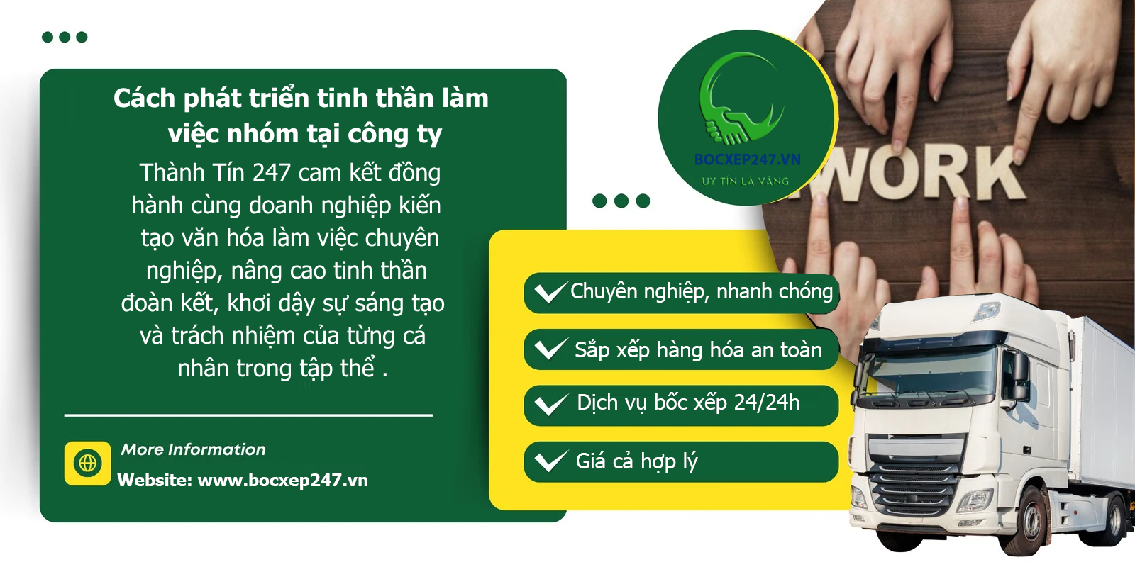 Trong môi trường kinh doanh hiện đại, tinh thần làm việc nhóm là yếu tố cốt lõi giúp doanh nghiệp đạt được thành công bền vững. Tại CÔNG TY TNHH THƯƠNG MẠI DỊCH VỤ VẬN TẢI NHÂN LỰC THÀNH TÍN 247, tinh thần làm việc nhóm không chỉ là một giá trị văn hóa mà còn là nền tảng để cung cấp các dịch vụ chất lượng cao như cung ứng lao động Thanh Hóa, bốc xếp hàng hóa, và vận chuyển hàng siêu trường siêu trọng. Bài viết này sẽ phân tích sâu về cách phát triển tinh thần làm việc nhóm tại công ty, với các chiến lược cụ thể, ví dụ thực tiễn, và vai trò của Thành Tín 247 trong việc xây dựng đội ngũ gắn kết.