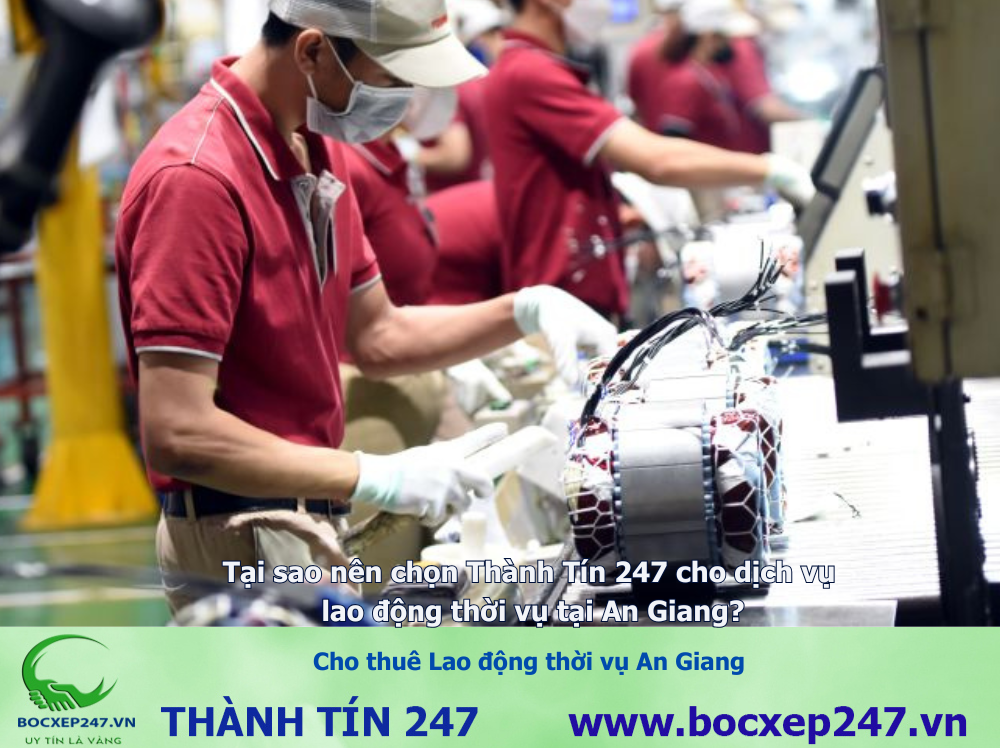 Dịch vụ cho thuê lao động thời vụ An Giang của Công ty TNHH Thương Mại Dịch Vụ Vận Tải Nhân Lực Thành Tín 247 là giải pháp tối ưu cho các doanh nghiệp và cá nhân tại An Giang. Với đội ngũ lao động chất lượng, quy trình làm việc chuyên nghiệp, và sự hỗ trợ tận tâm, chúng tôi cam kết mang lại giá trị vượt trội, giúp khách hàng tiết kiệm chi phí và tối ưu hóa hiệu suất công việc. Hãy liên hệ ngay hôm nay để trải nghiệm dịch vụ tốt nhất từ Thành Tín 247!