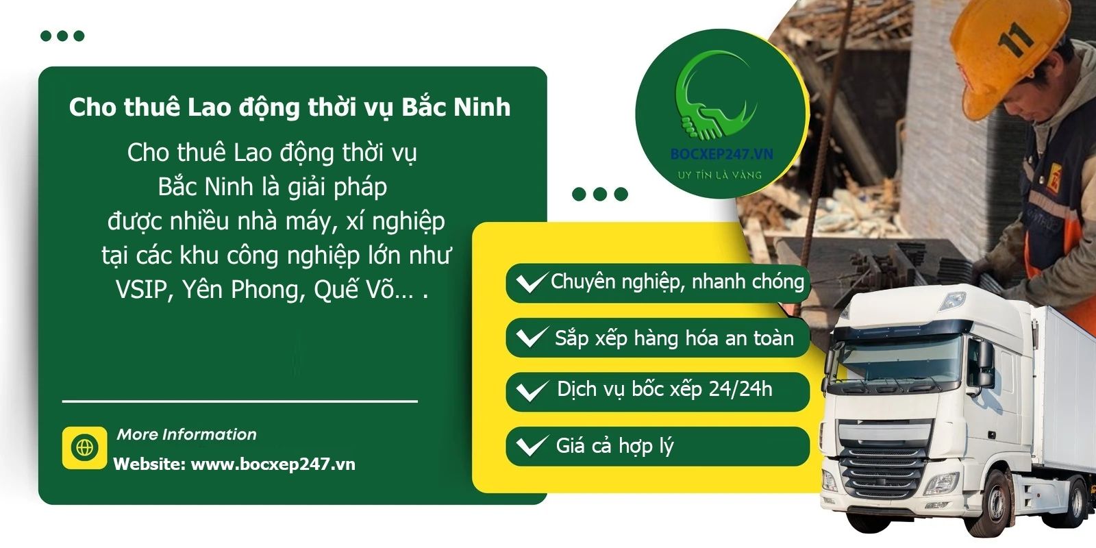 Cho thuê lao động thời vụ Bắc Ninh là giải pháp tối ưu cho các doanh nghiệp đang tìm kiếm nhân sự linh hoạt, chuyên nghiệp, và hiệu quả. Với kinh nghiệm, sự tận tâm, và dịch vụ đa dạng, CÔNG TY TNHH THƯƠNG MẠI DỊCH VỤ VẬN TẢI NHÂN LỰC THÀNH TÍN 247 tự hào là đối tác đáng tin cậy, giúp doanh nghiệp tại Bắc Ninh tối ưu hóa hoạt động sản xuất và logistics. Hãy liên hệ ngay hôm nay để nhận được sự hỗ trợ tốt nhất!