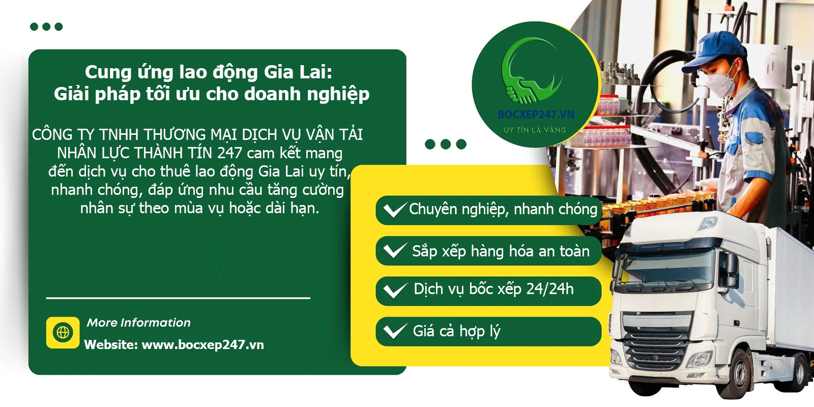 Trong bối cảnh nền kinh tế Việt Nam đang phát triển mạnh mẽ, nhu cầu về nguồn lao động chất lượng tại các tỉnh thành như Gia Lai ngày càng tăng cao. Cung ứng lao động Gia Lai đã trở thành một dịch vụ thiết yếu, hỗ trợ các doanh nghiệp đáp ứng nhu cầu nhân sự linh hoạt, tiết kiệm chi phí và tối ưu hóa hiệu quả sản xuất. Bài viết này sẽ cung cấp cái nhìn toàn diện về dịch vụ cung ứng lao động Gia Lai, những lợi ích mà nó mang lại, và vai trò của các công ty cung ứng lao động chuyên nghiệp như Công ty TNHH Thương Mại Dịch Vụ Vận Tải Nhân Lực Thành Tín 247.