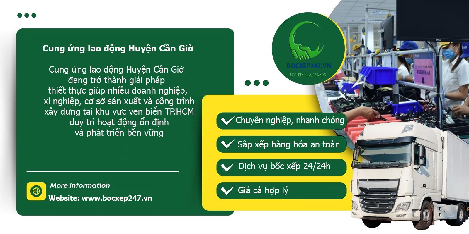 Huyện Cần Giờ, nằm ở phía Đông Nam của Thành phố Hồ Chí Minh, là một khu vực đặc biệt với vị trí địa lý ven biển, nổi tiếng với rừng ngập mặn được UNESCO công nhận là khu dự trữ sinh quyển thế giới. Bên cạnh vai trò là điểm đến du lịch sinh thái, Cần Giờ đang ngày càng phát triển trong các lĩnh vực kinh tế như thủy sản, logistics, xây dựng và dịch vụ. Sự phát triển này kéo theo nhu cầu lớn về lao động, đặc biệt trong các ngành như bốc xếp hàng hóa, vận tải, và cung ứng lao động thời vụ.