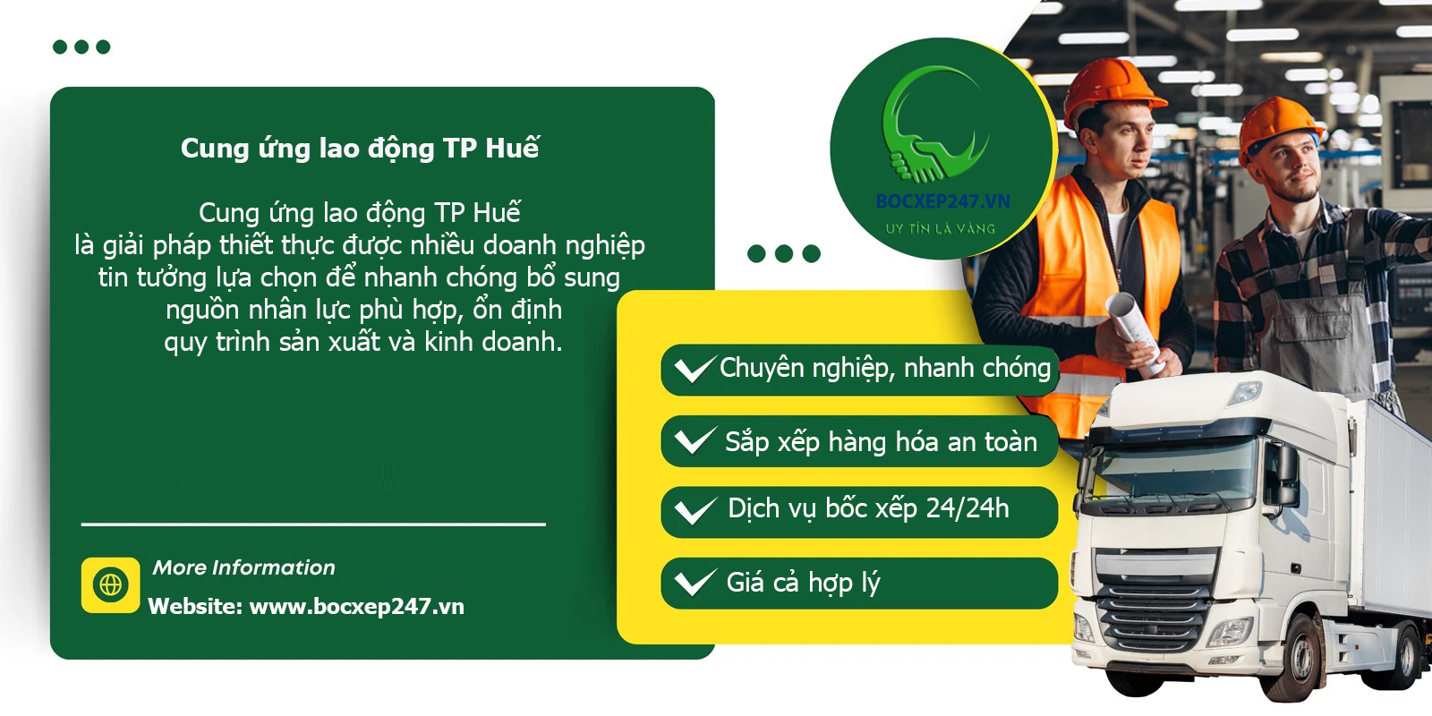 Cung ứng lao động tại TP Huế là một giải pháp chiến lược giúp doanh nghiệp vượt qua các thách thức về nhân sự, tối ưu hóa chi phí và nâng cao hiệu quả sản xuất. CÔNG TY TNHH THƯƠNG MẠI DỊCH VỤ VẬN TẢI NHÂN LỰC THÀNH TÍN 247, đã khẳng định vị thế là đối tác tin cậy, mang đến các dịch vụ chuyên nghiệp như cung ứng lao động thời vụ, bốc xếp hàng hóa, và vận chuyển hàng siêu trường siêu trọng. Với cam kết về chất lượng, giá cả hợp lý và dịch vụ hỗ trợ 24/7, Thành Tín 247 là lựa chọn lý tưởng cho các doanh nghiệp tại Huế.