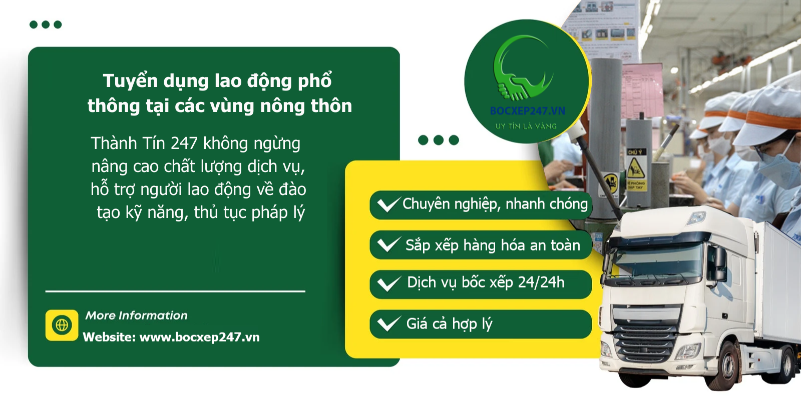 Bài viết này sẽ phân tích sâu sắc về thực trạng, cơ hội, thách thức và các giải pháp trong việc tuyển dụng lao động phổ thông tại các vùng nông thôn, đồng thời giới thiệu vai trò của Thành Tín 247 trong lĩnh vực này. Với các dịch vụ đa dạng như bốc xếp hàng hóa, bốc hàng container khu công nghiệp, bốc xếp kho xưởng, tháo dỡ chuyển nhà giá rẻ, cẩu hàng nặng, cho thuê người làm theo giờ, và vận chuyển hàng siêu trường siêu trọng, công ty đã và đang khẳng định vị thế của mình trong việc đáp ứng nhu cầu nhân lực chất lượng cao.