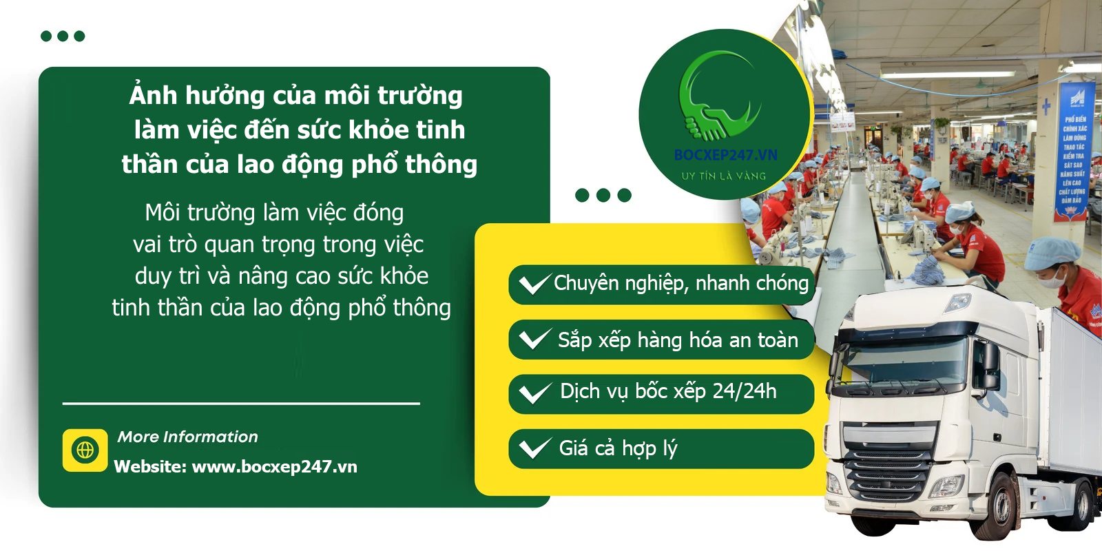 Trong bối cảnh công nghiệp hóa và hiện đại hóa, lao động phổ thông đóng vai trò quan trọng trong các ngành công nghiệp như logistics, sản xuất, và xây dựng. Tuy nhiên, sức khỏe tinh thần của nhóm lao động này thường bị bỏ qua, mặc dù môi trường làm việc có ảnh hưởng sâu sắc đến trạng thái tâm lý và chất lượng cuộc sống của họ. Năm 2025, với sự gia tăng áp lực công việc và nhu cầu về hiệu suất, việc cải thiện môi trường làm việc để hỗ trợ sức khỏe tinh thần của lao động phổ thông trở thành một ưu tiên cấp thiết. Bài viết này sẽ phân tích các yếu tố của môi trường làm việc ảnh hưởng đến sức khỏe tinh thần, các thách thức mà lao động phổ thông gặp phải, và đề xuất các giải pháp thiết thực, đồng thời liên hệ với các dịch vụ cung ứng lao động chuyên nghiệp của CÔNG TY TNHH THƯƠNG MẠI DỊCH VỤ VẬN TẢI NHÂN LỰC Bốc Xếp 247, một đơn vị uy tín trong lĩnh vực cung ứng lao động tại Việt Nam.