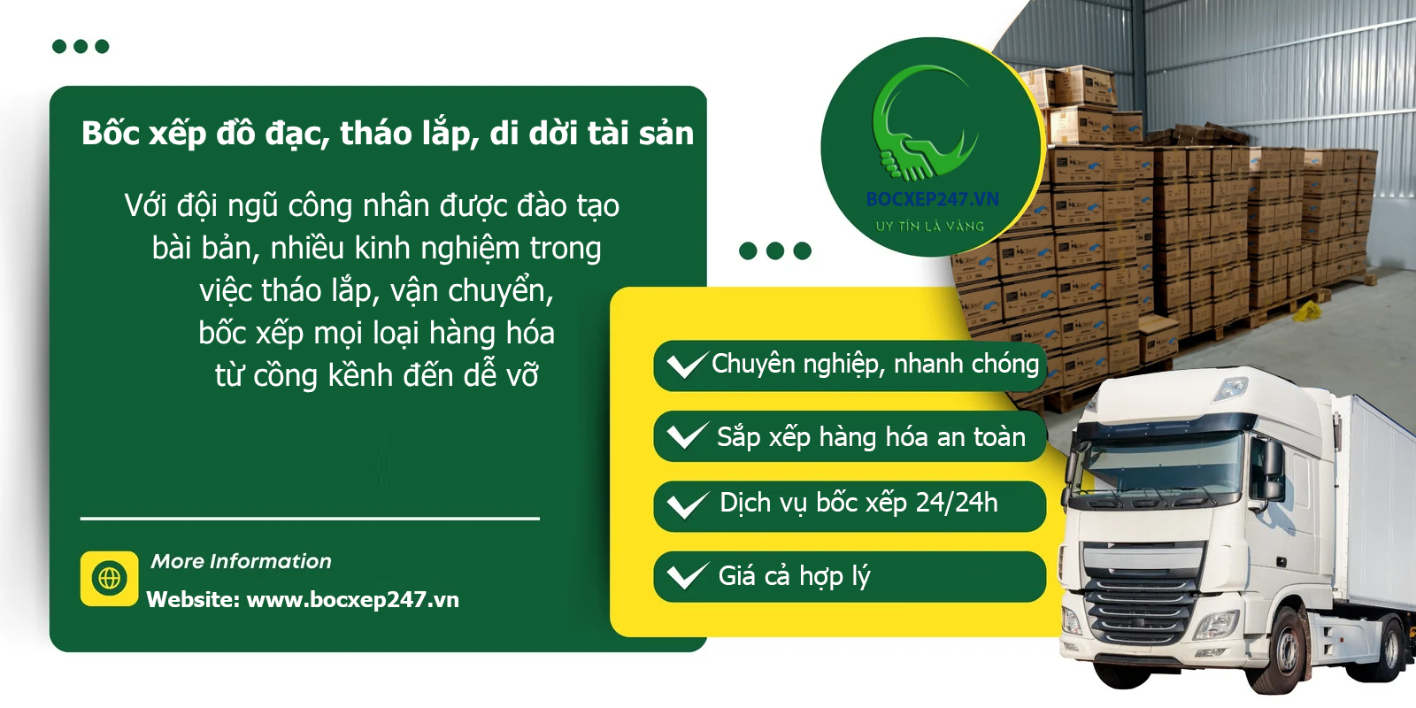 Dịch vụ bốc xếp đồ đạc, tháo lắp, di dời tài sản là giải pháp thiết yếu giúp cá nhân và doanh nghiệp tiết kiệm thời gian, chi phí và đảm bảo an toàn cho tài sản. Với sự hỗ trợ từ Bốc Xếp 247, khách hàng có thể yên tâm về chất lượng dịch vụ, từ bốc xếp hàng hóa, tháo dỡ chuyển nhà giá rẻ, đến vận chuyển hàng siêu trường siêu trọng. Hãy liên hệ ngay với Bốc Xếp 247 để nhận được giải pháp tối ưu cho mọi nhu cầu bốc xếp và di dời tài sản của bạn!