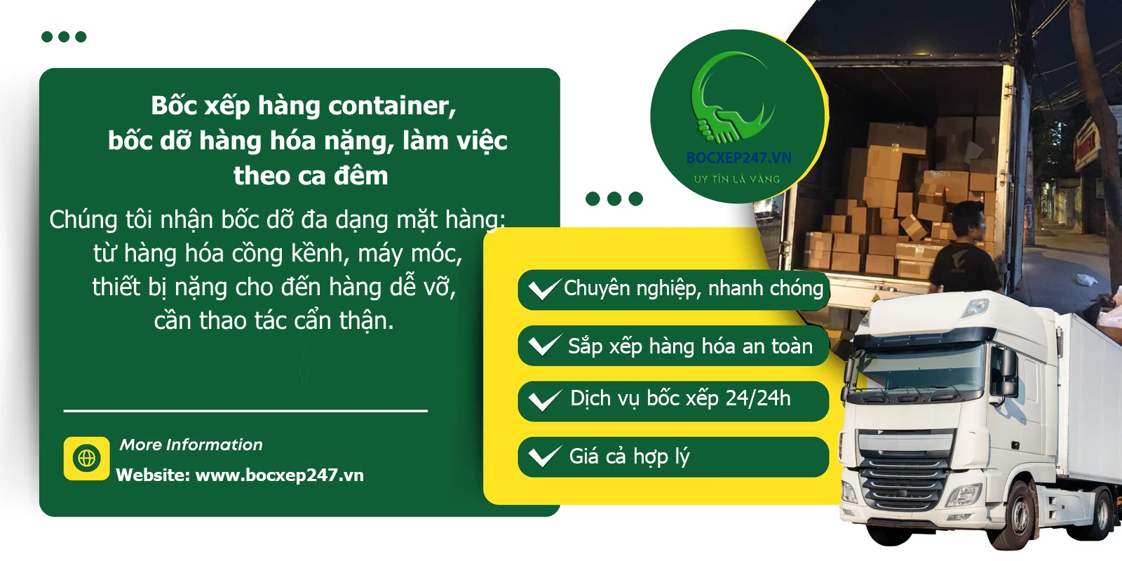Dịch vụ bốc xếp hàng container, bốc dỡ hàng hóa nặng, và làm việc theo ca đêm đóng vai trò quan trọng trong việc đảm bảo hiệu quả và tiến độ của chuỗi cung ứng. Với sự hỗ trợ từ các công ty cung ứng nhân lực uy tín như Bốc Xếp 247, doanh nghiệp có thể yên tâm về chất lượng lao động, an toàn hàng hóa và tính linh hoạt trong vận hành. Hãy liên hệ ngay với Bốc Xếp 247 để nhận được giải pháp tối ưu cho nhu cầu bốc xếp và logistics của bạn!