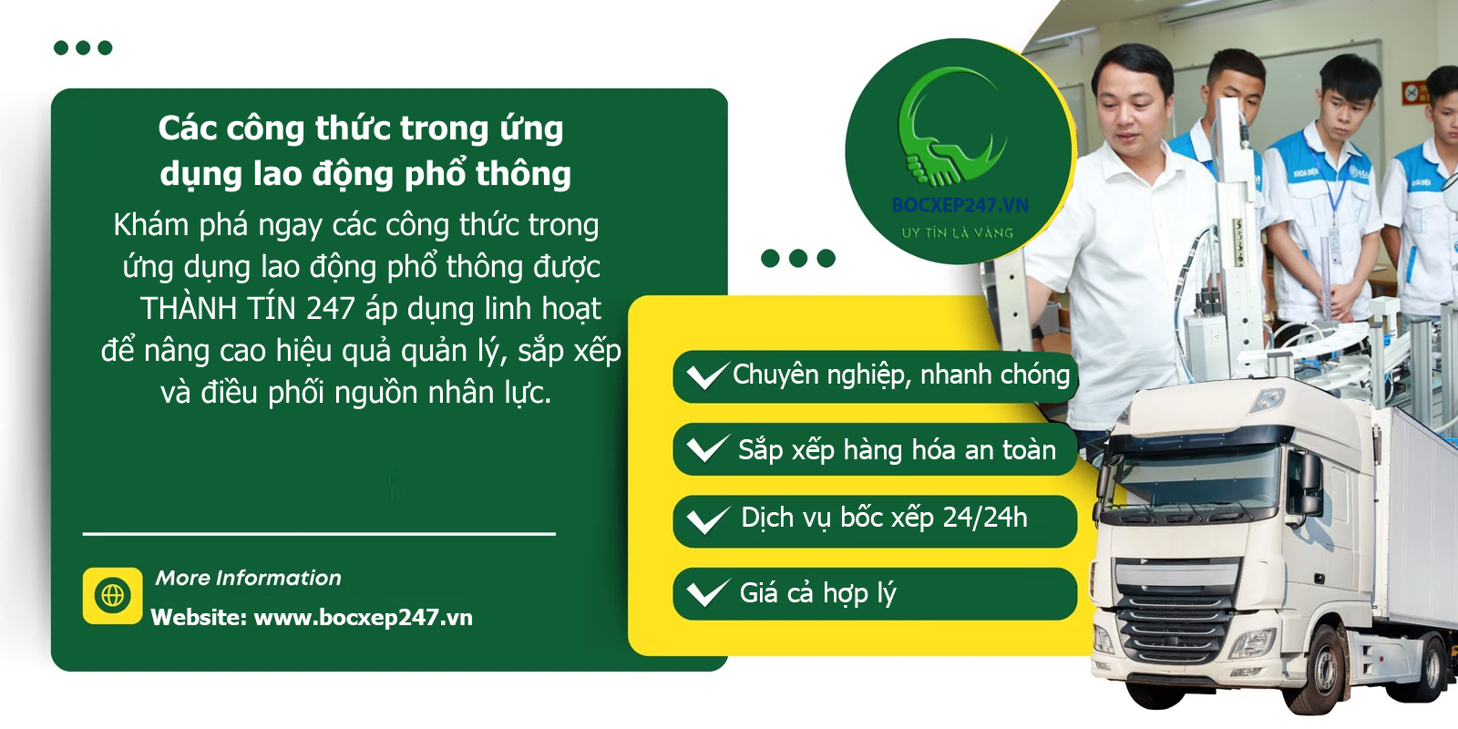 Trong bối cảnh nền kinh tế Việt Nam không ngừng phát triển, lao động phổ thông đóng vai trò quan trọng trong việc duy trì và thúc đẩy các hoạt động sản xuất, logistics, xây dựng và dịch vụ. Năm 2025, với sự gia tăng nhu cầu về lao động trong các ngành công nghiệp và dịch vụ, việc ứng dụng các công thức hiệu quả trong quản lý và sử dụng lao động phổ thông trở thành yếu tố then chốt để tối ưu hóa năng suất và giảm thiểu chi phí. Bài viết này sẽ phân tích các công thức, phương pháp và chiến lược trong việc ứng dụng lao động phổ thông, đồng thời làm nổi bật vai trò của CÔNG TY TNHH THƯƠNG MẠI DỊCH VỤ VẬN TẢI NHÂN LỰC Bốc Xếp 247, một đơn vị hàng đầu trong lĩnh vực cung ứng lao động tại Việt Nam.