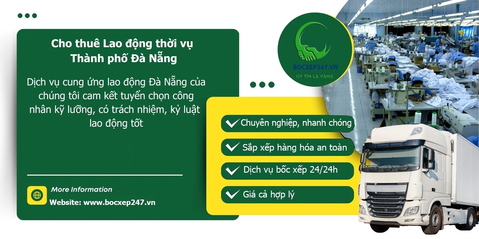 Thành phố Đà Nẵng, với vị trí trung tâm của miền Trung Việt Nam, là một trong những đô thị phát triển năng động nhất cả nước. Nơi đây không chỉ nổi tiếng với cảnh quan thiên nhiên tuyệt đẹp mà còn là trung tâm kinh tế, thương mại, và công nghiệp quan trọng. Sự phát triển mạnh mẽ của các ngành công nghiệp, logistics, xây dựng, và dịch vụ đã tạo ra nhu cầu lớn về lao động, đặc biệt là lao động thời vụ. Trong bối cảnh đó, CÔNG TY TNHH THƯƠNG MẠI DỊCH VỤ VẬN TẢI NHÂN LỰC Bốc Xếp 247 đã khẳng định vị thế của mình như một đơn vị cung cấp dịch vụ cho thuê lao động thời vụ tại Đà Nẵng uy tín, chuyên nghiệp, và đáng tin cậy.