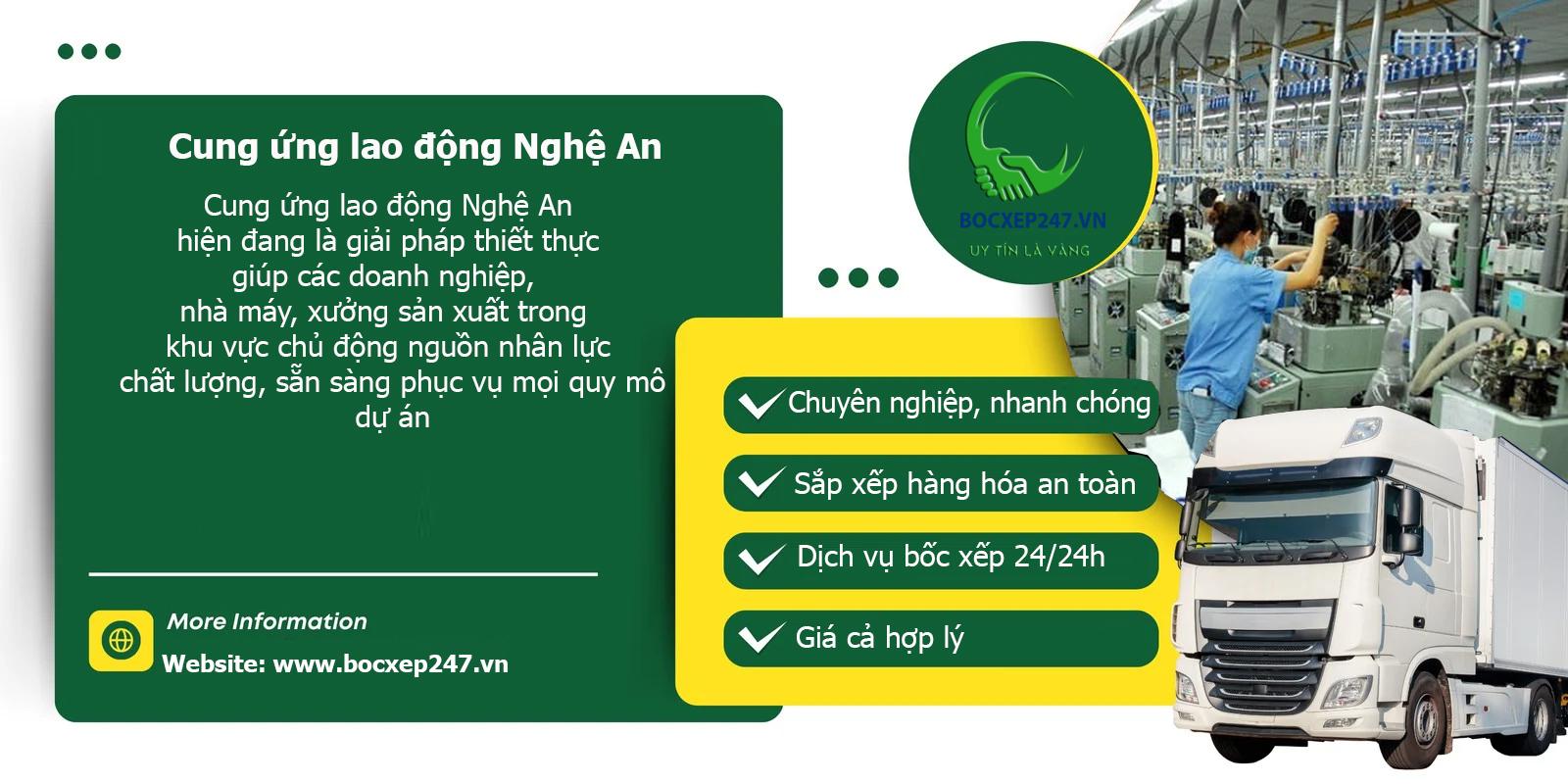 Trong bối cảnh nền kinh tế Nghệ An đang phát triển mạnh mẽ, nhu cầu về lao động chất lượng cao ngày càng trở nên cấp thiết. CÔNG TY TNHH THƯƠNG MẠI DỊCH VỤ VẬN TẢI NHÂN LỰC Bốc Xếp 247 tự hào là đối tác tin cậy, mang đến các giải pháp cung ứng lao động hiệu quả, linh hoạt và tiết kiệm chi phí cho doanh nghiệp. Với các dịch vụ đa dạng như bốc xếp hàng hóa, cho thuê người làm theo giờ, và vận chuyển hàng siêu trường siêu trọng, Bốc Xếp 247 cam kết đáp ứng mọi nhu cầu của khách hàng tại Nghệ An.