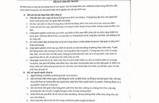 Nội quy áp dụng cho nhân sự làm việc tại kho